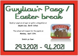 Byddwn yn cau ar gyfer pythefnos o wyliau Pasg ar ddydd Gwener, Mawrth 26ain.